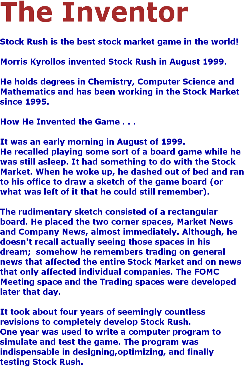 Home About Stock Rush Extensive Game Features Buy The Game The Inventor (You Are Here.) Frequently Asked Questions (FAQs) Contact Us